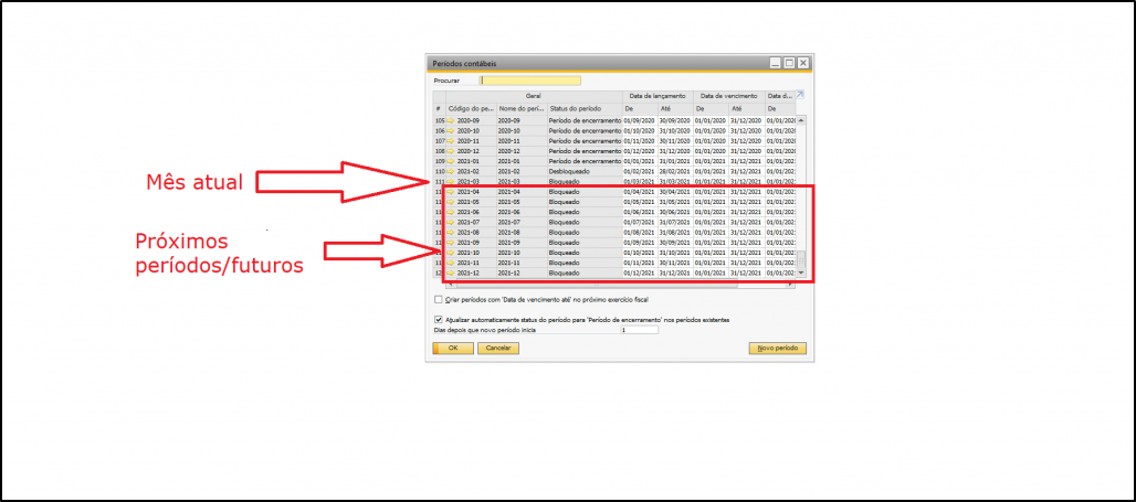 - Verifique o período contábil atual no SAP e altere seu status para Desbloqueado.