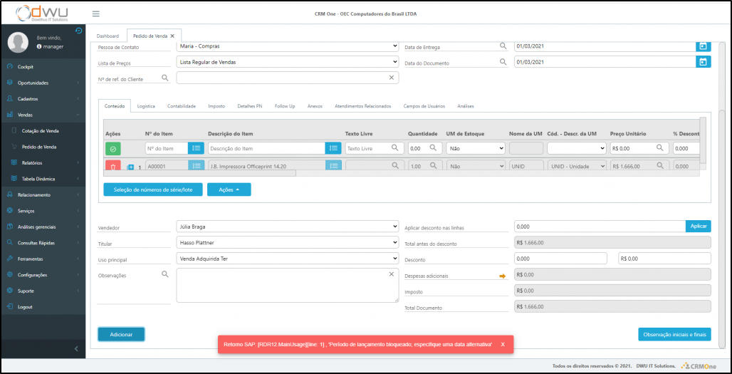 Após esses passos, tente novamente lançar o documento no CRM One.