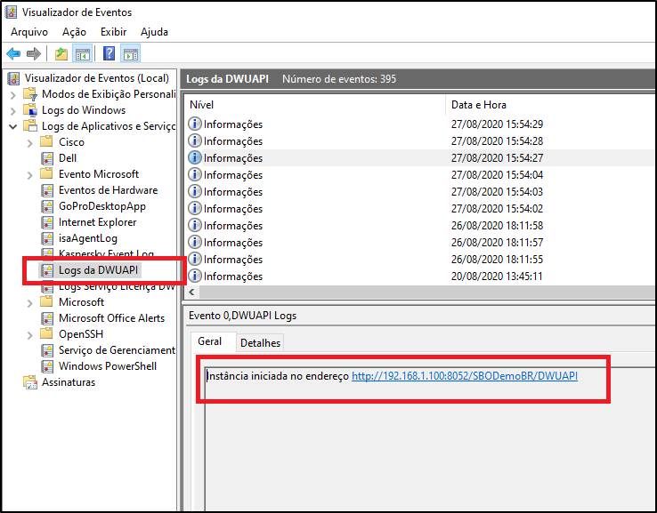 O endereço local da API pode ser encontrado no Event Viewer (Visualizador de Eventos) do servidor onde a API foi instalada, conforme o exemplo abaixo: