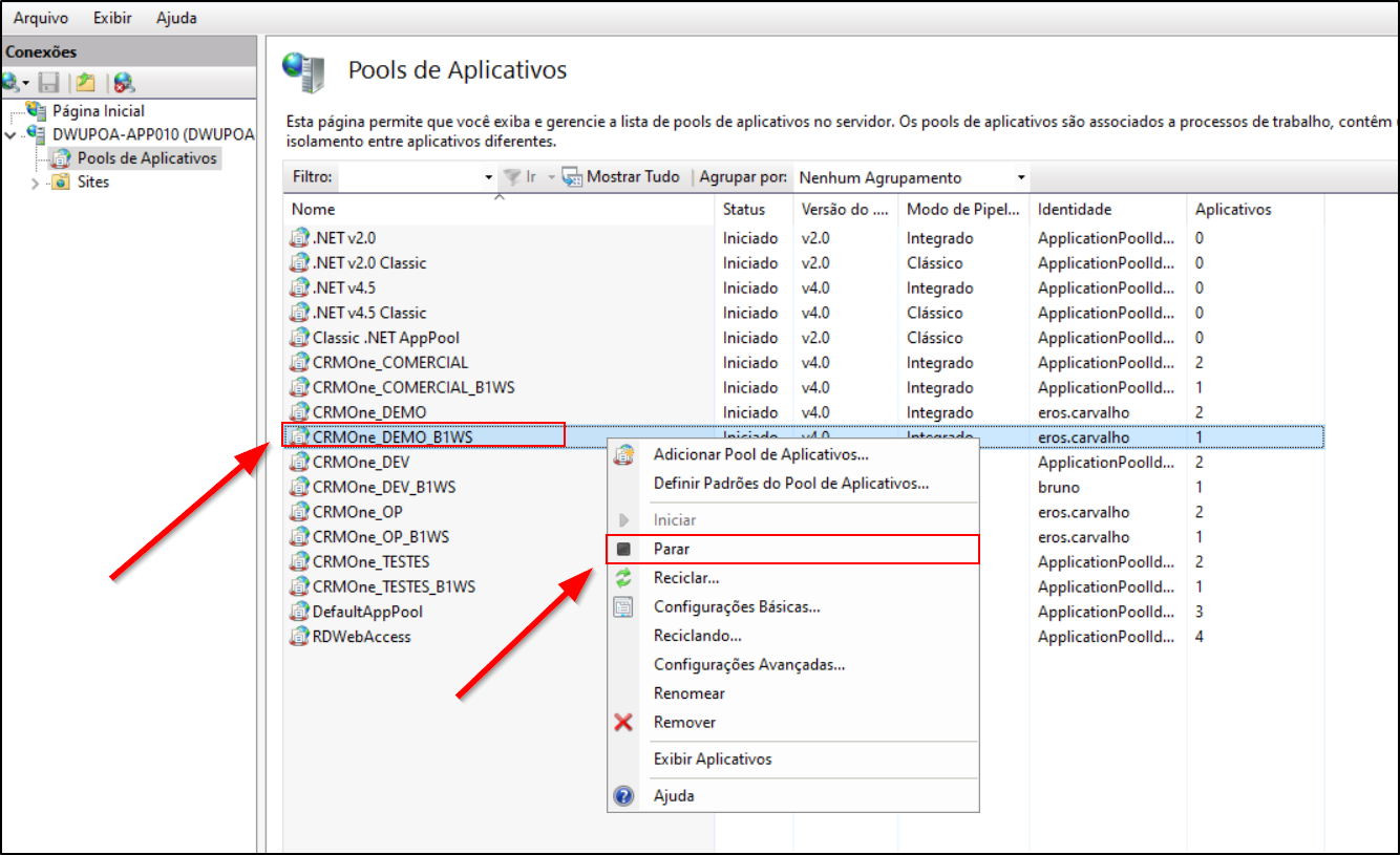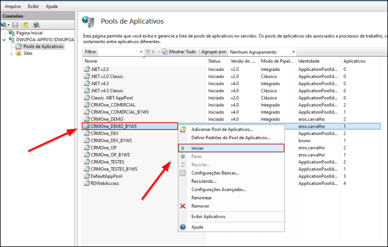 - Clique com o botão direito sobre o pool.