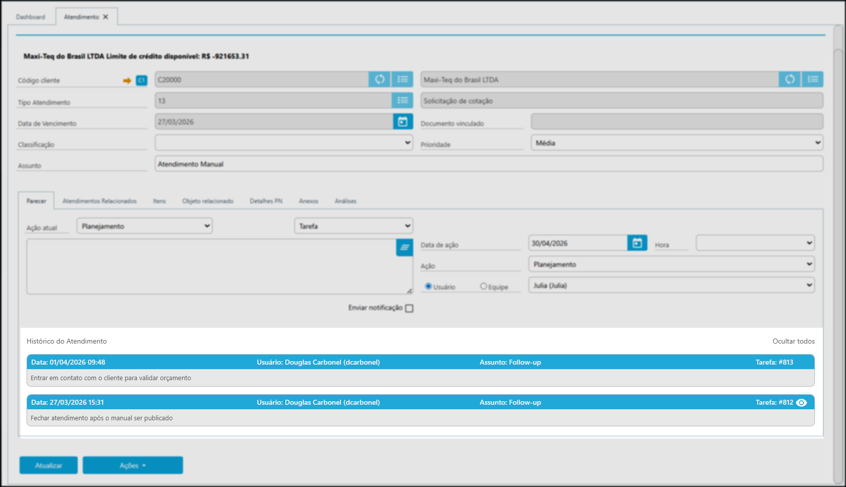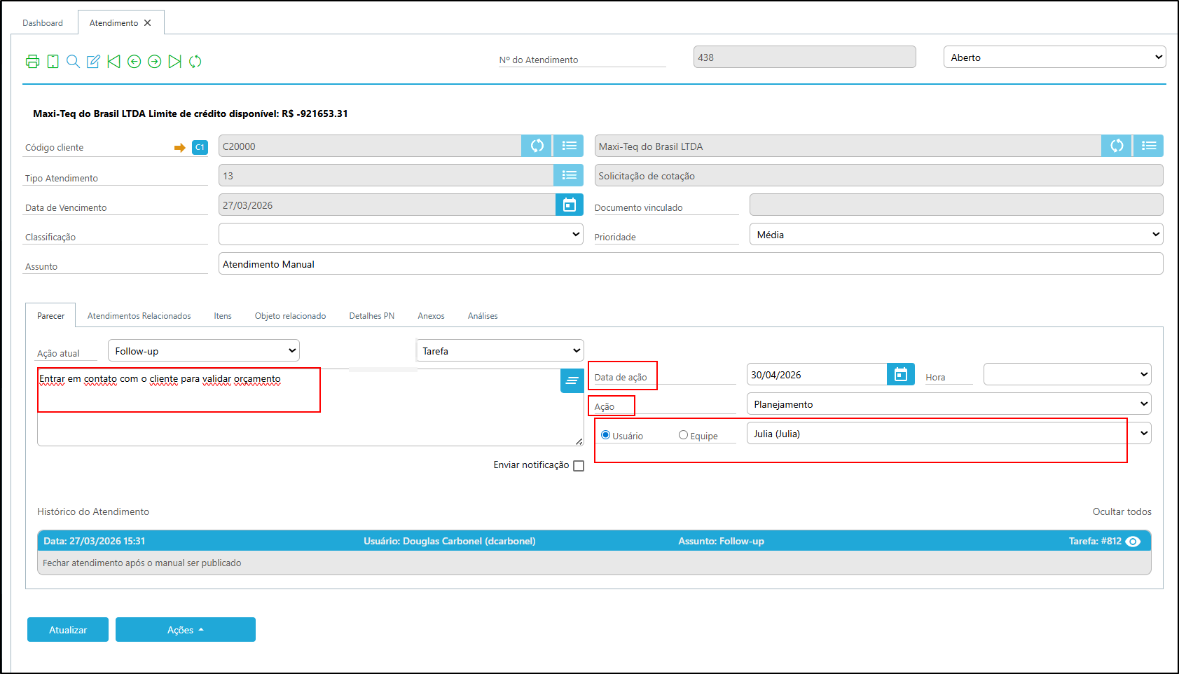 Nesse cenário, a responsabilidade foi atribuída à usuária Julia, com prazo definido para execução da ação.