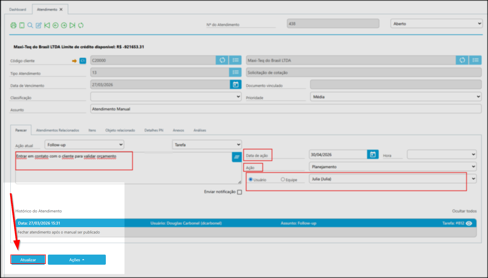 Neste exemplo, foi definido um follow-up para acompanhamento com o cliente: