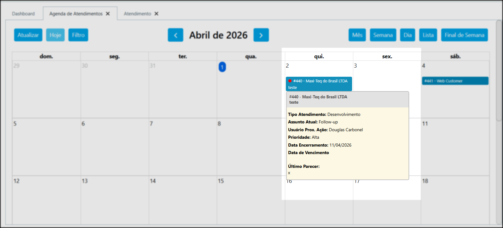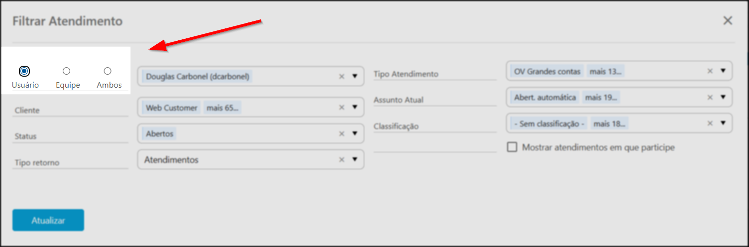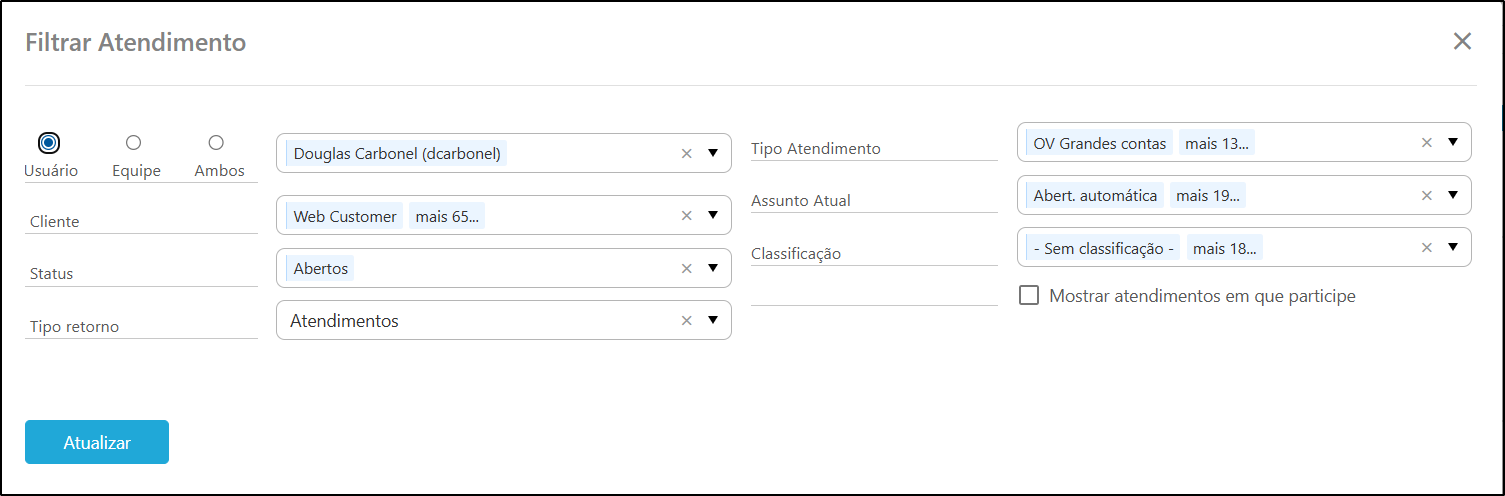 - Usuário: mostra apenas atendimentos do usuário selecionado.
