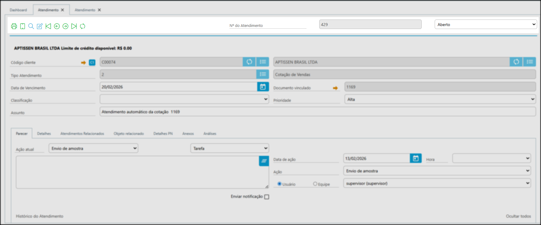 A aba Parecer é a mais importante do atendimento, pois concentra toda a operação e histórico.