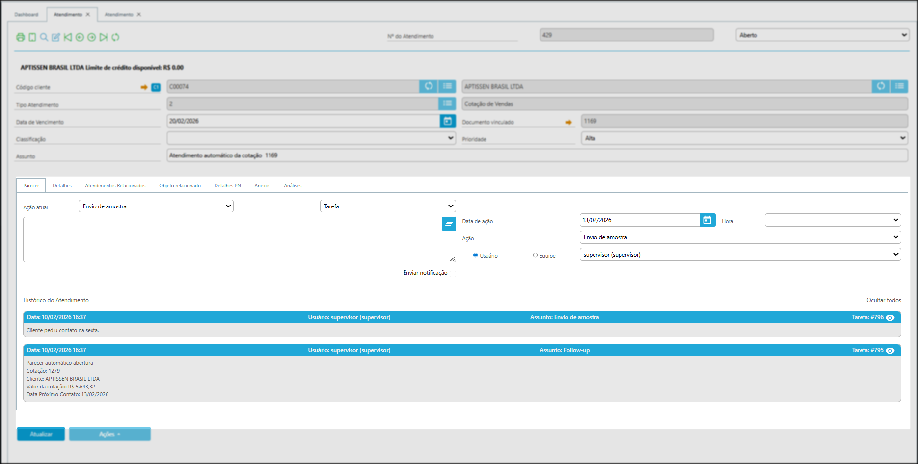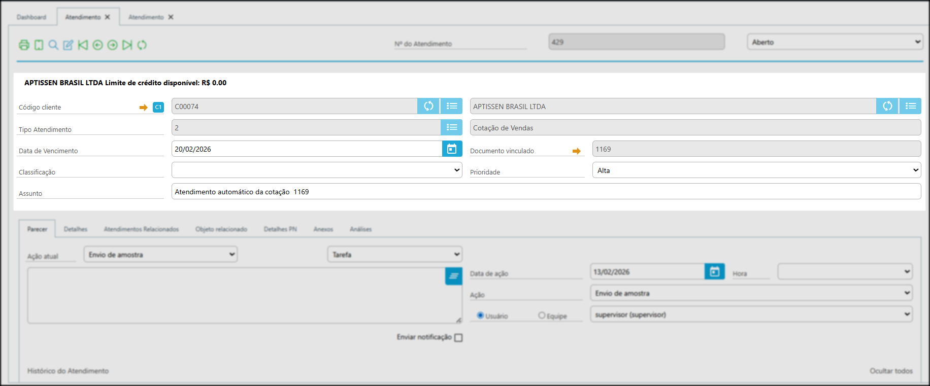 - Exemplo: ao gerar atendimento a partir de uma cotação, o número da cotação será exibido.