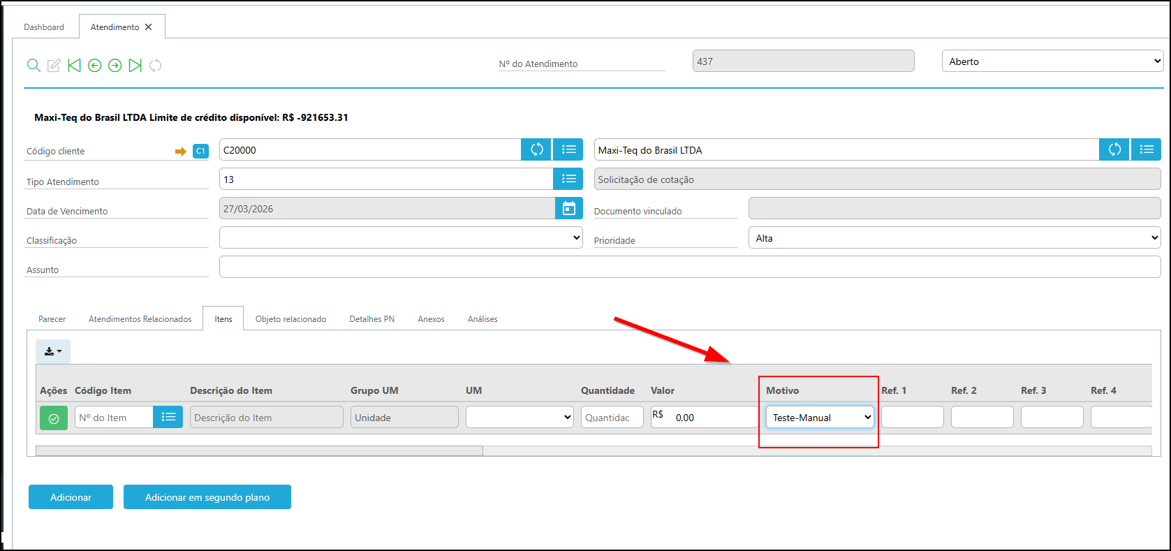 Ao utilizar um tipo de atendimento da categoria Itens, será possível selecionar o motivo diretamente no item do atendimento.