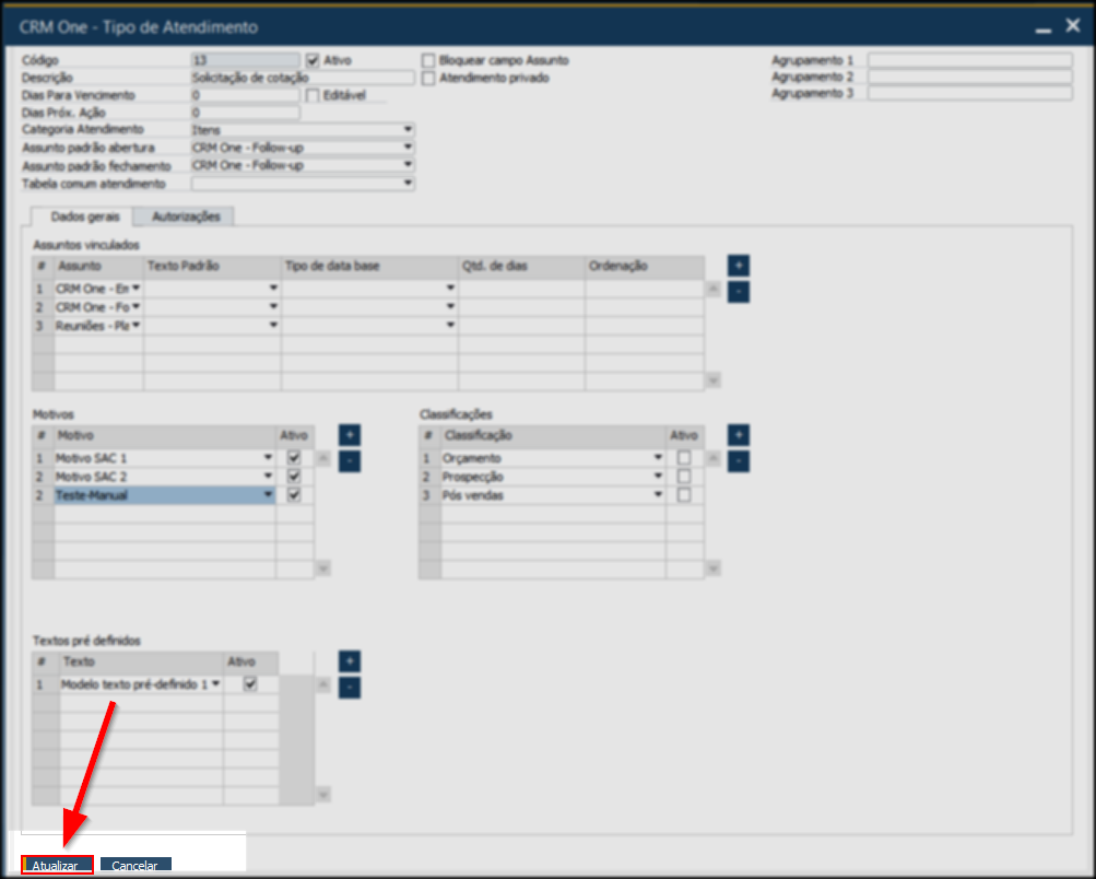 Para que o motivo fique disponível no atendimento, é necessário vinculá-lo a um tipo de atendimento.