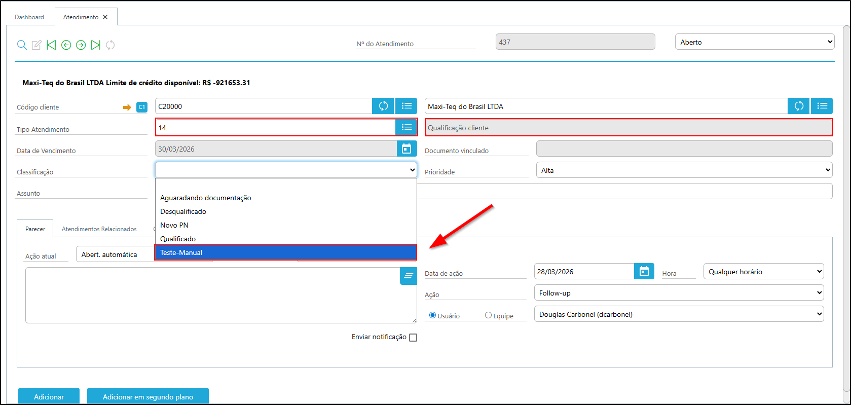 Ao selecionar o tipo de atendimento configurado, a nova classificação poderá ser escolhida no campo correspondente.
