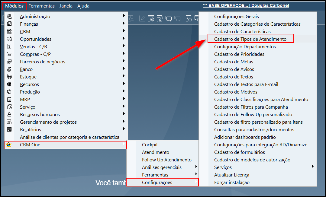 - Clique em Cadastro de tipos de atendimento.