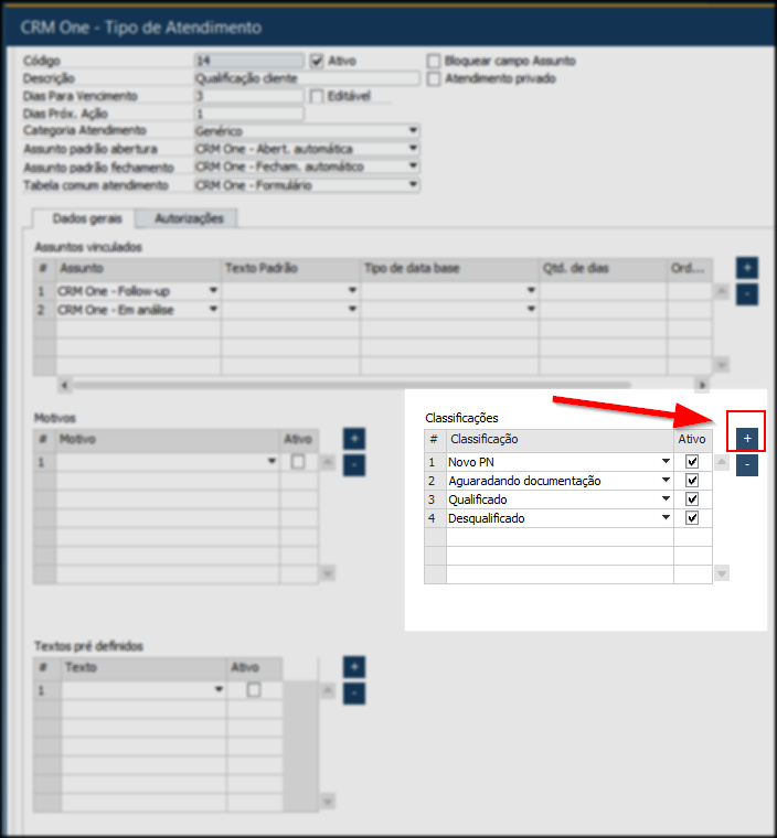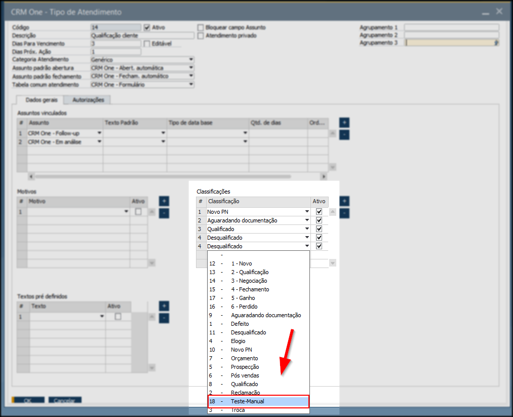 Cadastro e vinculação de classificações no CRM One