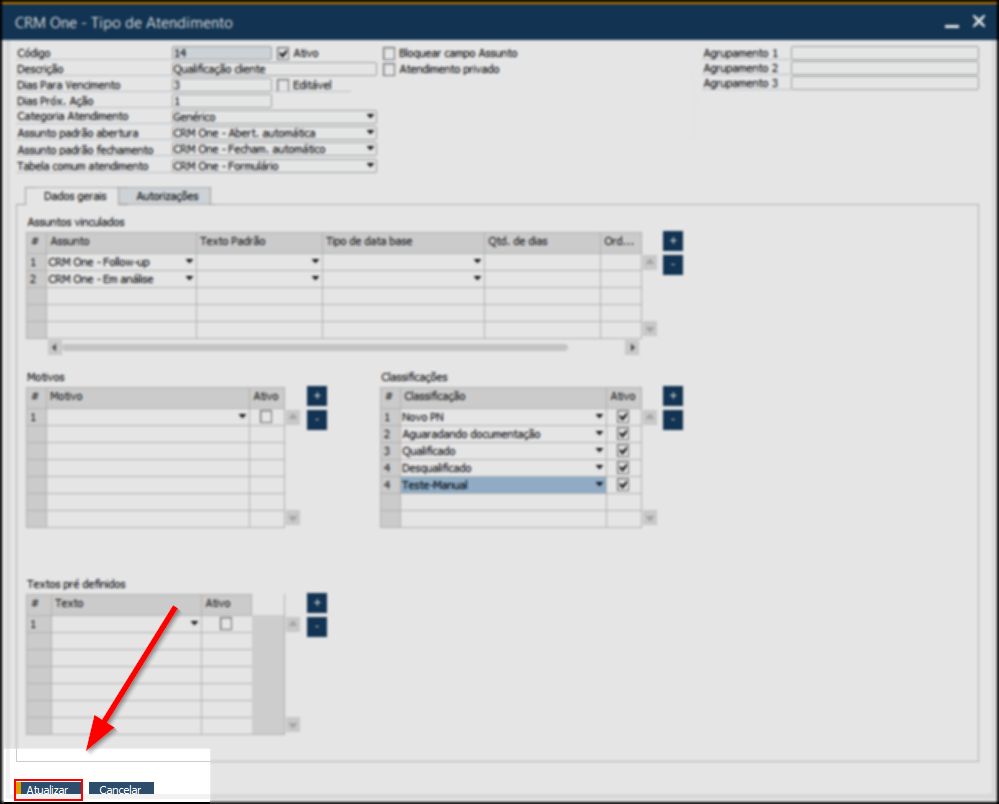 Para que a classificação fique disponível na criação de atendimentos, é necessário vinculá-la a um tipo de atendimento.