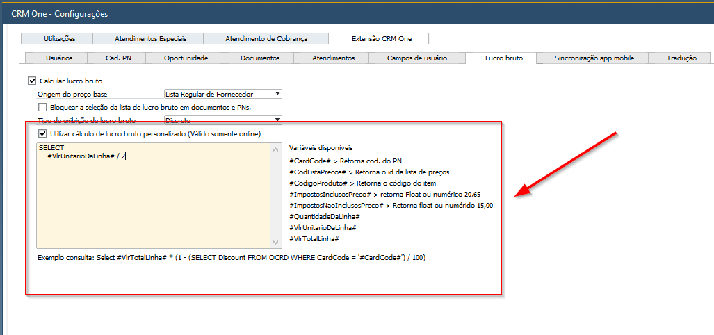 O CRM One disponibiliza duas abordagens para cálculo de lucro bruto: